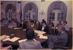 President Jimmy Carter (bottom right) meets with NACW members, including Bella Abzug (center right, in hat) and others. Abzug would be dismissed shortly after this meeting, and the committee would completely change within days.