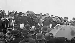 The actual groundbreaking ceremony was grey and rainy. Though hundreds were in attendance, Thomas L. Sloan was the only Native American in addition to the chiefs. Taft was greeted with a 21-gun salute and spent an hour there, giving a brief speech and digging first with a silver spade and later with a Native stone axe.[19][15][20][21] Other politicians in attendance included members of Taft's cabinet and the Mayor of New York City and the governor of New York State.[22] Shortly after Chief Wooden Leg, who was in the Native delegation, began digging with a buffalo thigh bone. They then raised an American flag while Irving Morgan's "The Indian's Requiem" was playing. the declaration of allegiance was signed, and 27-33 Buffalo nickels were distributed for the first time by George Frederick Kunz.[19][15][20][21]