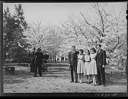 The effort to bring cherry blossom trees to Washington, D.C., preceded the official planting by several decades. In 1885, Eliza Ruhamah Scidmore returned from her first trip to Japan and approached the U.S. Army Superintendent of the Office of Public Buildings and Grounds with the idea of planting cherry trees along the reclaimed waterfront of the Potomac River. Scidmore, who would go on to become the first female board member of the National Geographic Society, was rebuffed, though she would continue proposing the idea to every Superintendent for the next 24 years.[4] Several cherry trees were brought to the region by individuals in this period, including one that was the location of a 1905 cherry blossom viewing and tea party hosted by Scidmore in northwest D.C. Among the guests was prominent botanist David Fairchild and his fiancée Marian, the daughter of inventor Alexander Graham Bell.[5]