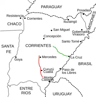 National Route 119 is a national road in Argentina, running north in the Center-South of Corrientes Province. It starts at the crossing with national routes 14 and 127 running for 109 kilometres (68 mi) until it crosses National Route 123 in Mercedes. The road is marked in red in the map. The whole length of the road is within Corrientes Province, crossing through Monte Caseros Department, Curuzú Cuatiá Department, and Mercedes Department.