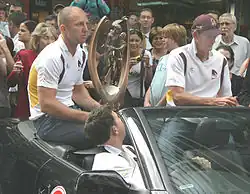 Each NRL season typically runs from March to October, with each team playing 24 matches. The first-placed team at the end of the regular season are awarded the J. J. Giltinan Shield for winning the minor premiership. This is followed by a finals series contested between the top eight placed teams from the regular season, which determines the two teams to compete in the NRL Grand Final held at Stadium Australia. The team that wins the match are awarded the Provan-Summons Trophy in recognition for becoming the premiers of the season,[4] and qualifies them to compete in the World Club Challenge against the champions of the English Super League.[5] The reigning premiers are the Penrith Panthers, having won a record fourth consecutive and sixth overall title, in the 2024 NRL season.