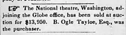 National Theatre was founded on December 7, 1835, by William Wilson Corcoran and other prominent citizens who wanted the national capital to have a first-rate theatre.[3] The theatre's initial production was Man of the World.[3] It was purchased in 1844 by Benjamin Ogle Tayloe of the B.O. Tayloe House for $13,950.[4]