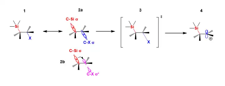 In the β effect, reactions that develop positive charge on carbon atoms β to the silicon accelerate. The C–Si σ orbital partially overlaps the with the C–X (leaving group) σ* orbital (2b):