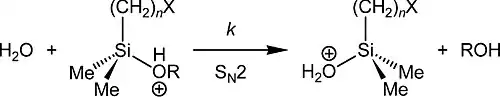 In general, they find that under basic conditions, the rate of hydrolysis is mainly controlled by the electrophilicity of the silicon center and the rate of the hydrolysis of the γ-silanes is less influenced by the generally electronegative functional groups than α-silanes. More electronegative the functional groups are, the higher the rate of hydrolysis. However, under acidic conditions, the rate of hydrolysis depends on both the electrophilicity of the silicon center (determining the molecular reactivity) and the concentration of the (protonated) reactive species. Under acidic conditions, the nucleophile changes from OH− to H2O, so it involves the process of protonation and the atoms are protonated could be either silicon or the functional group X. As a result, the general trend in acidic solution is more complicated.