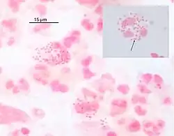 Gram stain of a vaginal swab showing gonococci (in pairs - arrow) inside polymorphonuclear granulocytes