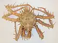Neolithodes has a pyriform carapace which does not cover the bases of its walking legs.[2] Of its three pairs of walking legs, the rearmost are the longest, and all of them have a similar form.[3] At the very front center of the carapace, its rostrum consists of a median spine and a pair of upward-slanted (dorsal) spines.[3] Behind the rostrum sits the elevated gastric region, followed by a deep groove separating it from the triangular cardiac region.[3] The cervical groove behind that is shallow and indistinct.[3] When measuring the carapace's length without including the rostrum,[a] the carapace is always shorter than the walking legs.[3]