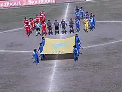 Players of Nepal Police Club (in red jersey) lining up for a match against Three Star Club