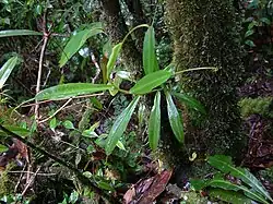 Leaves are sessile and coriaceous.[2] The lamina is lanceolate-spathulate in form. It may be up to 10 cm long and 2 cm wide. It has an acute apex and is gradually attenuate towards the base, which clasps the stem for one third to a half of its circumference.[2] Around three pairs of longitudinal veins are present on the lamina, originating from the basal third of the midrib. Pinnate veins are oblique and irregularly reticulate, although they are not easily distinguishable.[2] Tendrils can be up to 15 cm long and may or may not have a curl.[8]