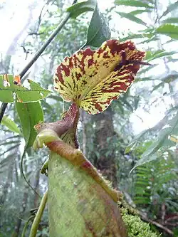 Rosette and lower pitchers are ovoid in the lower part, becoming cylindrical above. They are large, growing to 33.5 cm high by 6.8 cm wide. A pair of fringed wings (≤0.5 cm wide) runs down the ventral surface of the pitcher cup. Fringe elements are up to 1.9 cm long. The pitcher mouth is ovate and elongated into a short neck at the rear. The greatly expanded peristome may be up to 5.8 cm wide at the sides. Its inner margin is lined with distinct teeth, with those of the neck reaching 0.4 cm in length. The pitcher lid or operculum is ovate and has an unusual undulate margin. It measures up to 8.5 cm in length by 7.2 cm in width and has a cordate base. Four to five pairs of veins are visible on the upper surface of the lid. The lid bears two prominent appendages on its lower surface. The first is a hooked basal crest up to 0.7 cm long. The second is a triangular, dichotomous appendage present near the apex. This unique feature measures up to 1.4 cm in length and bears large nectar glands (0.5 to 1 mm in diameter). Smaller glands (0.1 to 0.5 mm in diameter) are concentrated along the midrib. An unbranched spur (≤2.8 cm long) is inserted near the base of the lid.[2]