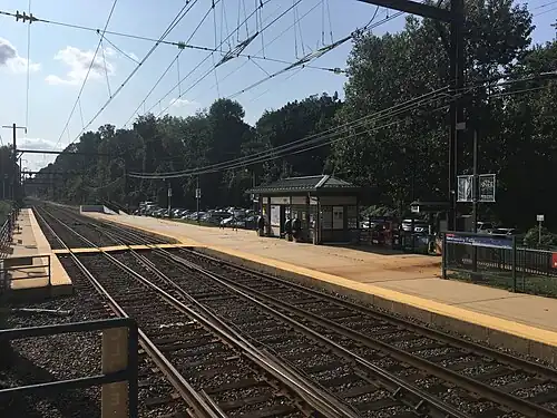 The station at Neshaminy Falls, facing inbound towards Center City Philadelphia from the mini-high level platform on the outbound (West Trenton-bound) side.