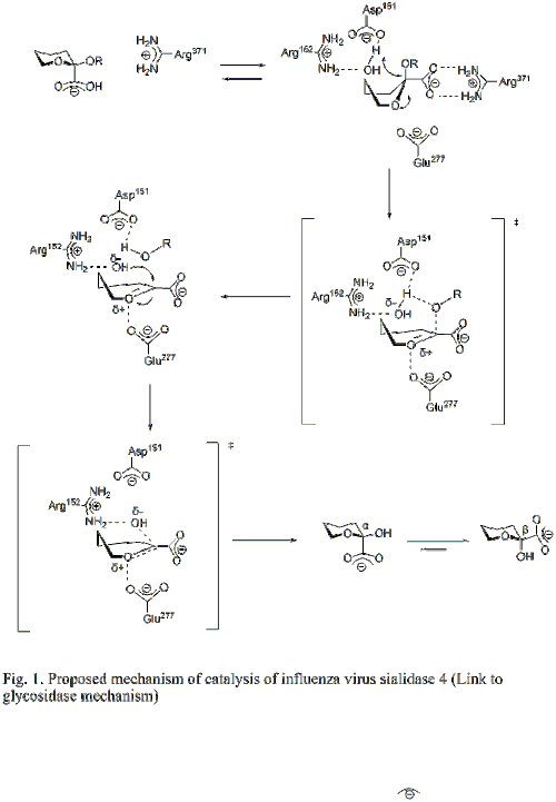 - ^ Taylor NR, von Itzstein M (March 1994). "Molecular modeling studies on ligand binding to sialidase from influenza virus and the mechanism of catalysis". Journal of Medicinal Chemistry. 37 (5): 616–24. doi:10.1021/jm00031a011. PMID 8126701.