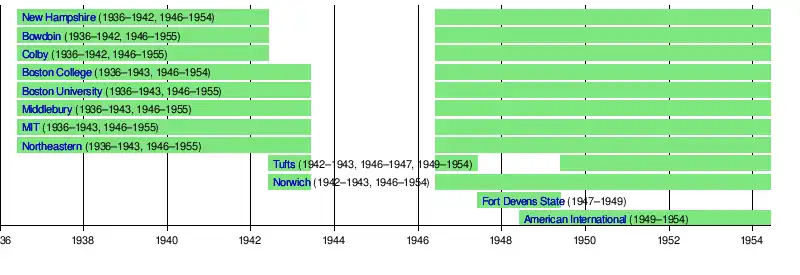 The league continued unaltered until World War II forced several members to suspend operations. In 1942, Hew Hampshire, Colby and Bowdoin were replaced by Tufts and Norwich. The following year, the league was suspended due to most other programs stopping for the duration of the war. The league returned in 1946, once college hockey resumed in full. A year later, the league held its first postseason and became the first unofficial conference to hold a postseason game in over 40 years. In 1949, Boston College became the first league member to win a National Championship.