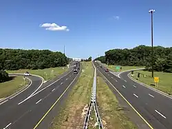 The current alignment of Route 138 originates as an alignment of the State Highway Route 38 assigned in 1938. At that point, Route 38 was proposed as a highway from Camden (where it would end), past its former terminus at State Highway Route 39 to an intersection with State Highway Route 4-N in the community of Wall Township east of Fort Dix.[4] A short portion of the highway was constructed from State Highway Route 34 to State Highway Route 35 was constructed as Route 38, which survived the 1953 state highway renumbering.[5] During the 1960s, the New Jersey State Highway Department began to lay out a network of limited-access state highways across the state. The Route 38 freeway was proposed as a highway from Interstate 676 in Camden to current-day Route 18 in Wall Township, to relieve congestion off of Route 70.[6] The freeway was readopted by the Delaware Valley Regional Planning Commission for the new Route 38 freeway from the Ben Franklin Bridge eastward (paralleling Route 70 and U.S. Route 30) to the area of Jackson Township, where it would follow current Interstate 195's alignment.[7] The 33.5-mile-long (53.9 km) freeway was estimated by the highway department to cost $60 million (equivalent to $514.5 million in 2024)[8] and to be finished around 1985.[7] The proposal lasted through the 1970s, along with a cost adjustment in 1972, inflating the amount to construct the freeway at $101 million (equivalent to $759.2 million in 2024).[9] By the end of the 1970s, the Route 38 freeway was facing opposition and limited resources, so the project was shelved. On July 29, 1988, the portion of Route 38 from Route 34 to Route 35 was re-designated to Route 138.[10]