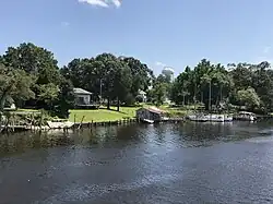 The New River is a 50-mile (80-km) long river in southeastern North Carolina in the United States. It empties into the Atlantic Ocean. The river has been plagued in more recent years by pollution by solid waste. It rises in northwestern Onslow County and flows east-southeast past Jacksonville, where it widens into a tidal estuary approximately two miles (3.2 km) wide. As an estuary it meanders through Marine Corps Base Camp Lejeune and enters the Atlantic in Onslow Bay, via the New River Inlet between two barrier islands. The Atlantic Intracoastal Waterway crosses the entrance of the river between the coast and the barrier island.