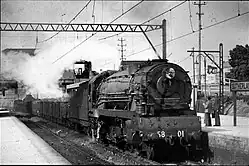 In 1943, approval was given for the New South Wales Government Railways Workshops to build 25 freight locomotives. The design was a modified version of the 57 class. The main alterations were the use of a rack and pinion valve gear[1] in lieu of the Gresley 2:1 conjugated valve gear for the middle cylinder and the use of smaller cylinders to enable the locomotives to run to on the Main North line to Broadmeadow, a route which had a tighter loading gauge. They also used a Woodard divided drive of twin coupling rods between the second and third driving wheels. A valance was fitted over the valve gear on the front platform.[2] Similarly to the earlier D57 class and the later AD60 class, the 58 class were fitted with a mechanical stoker to feed the large firebox