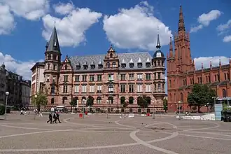 The New Town Hall (German: Neues Rathaus) is a town hall on the Schlossplatz in Wiesbaden, Hesse, Germany. It hosts the city government including the city council, offices of the mayors and part of the administration. It was built between 1884 and 1887 by Georg von Hauberrisser in a Renaissance Revival architecture style. The basement is almost completely occupied by a restaurant called Ratskeller.