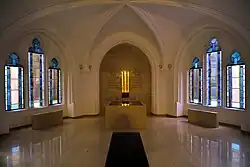 In 1958 a memorial room was set up on the first floor on the Marienplatz side in the same place where after the First World War a memorial room had existed but had been destroyed in the Second World War. In the redesigned room there are two stone panels beside a mosaic created by Karl Knappe, which reminisce those that died in the two world wars and those politically persecuted in the time of Nazism. A floor slab commemorates the city employees who died in service.[19][20]
