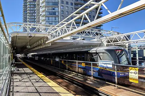 New Westminster is an elevated station on the Expo Line of Metro Vancouver's SkyTrain rapid transit system. The station is located at the intersection of Columbia Street and 8th Street in New Westminster, British Columbia. In 2012, the station was incorporated into the Shops at New West complex, making it the first train station in Canada to have a direct connection to a shopping centre at the platform level.[2]