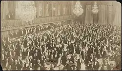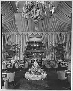 On the 23rd story of the hotel was the grand ballroom and banquet hall.[12][13] The grand ballroom was called the Cascades because there was a large waterfall at one end.[48] It was designed in the Louis XVI style[5][50] and was decorated in a gold and blue color scheme.[50] The ballroom and banquet hall contained loges, with box seating, on three sides.[12] The ballroom also had movable windows, which measured 10 by 25 feet (3.0 by 7.6 m). The ballroom was typically used for lunch, dinner, and banquets, although visitors could only enter by invitation. The center of the ballroom was used as a dance floor at night.[48] During the summer months, the hotel's managers could open the windows and convert the ballroom into an open-air loggia;[12][9][34] this was a major amenity for guests before air conditioning became popular.[25] The ballroom also had its own foyer, assembly room, lounging room, bar, and kitchen.[8][12] The space could have a capacity of 600 people.[34] North of the grand ballroom was a first-aid wing.[7]
