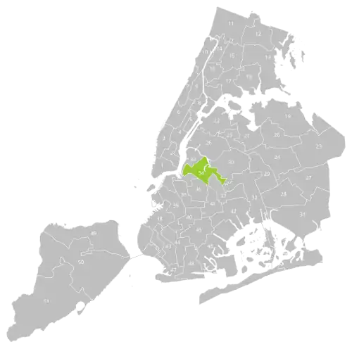 The district overlaps with Queens Community Board 5 and Brooklyn Community Boards 1 and 4, and with New York's 7th, 8th, and 12th congressional districts. It also overlaps with the 12th, 15th, 18th, and 26th districts of the New York State Senate, and with the 37th, 38th, 50th, 53rd, and 54th districts of the New York State Assembly.[5]