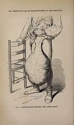 Full-page engraved illustration of elephantiasis of the scrotum from the May 1867 issue