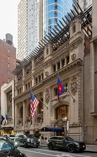 The building is seven stories tall; the uppermost stories are within a mansard roof. The building's facade is made of finely-grained limestone, behind which is a brick wall.[27] Only the southern elevation of the facade, along 44th Street, is visible.[28] As planned, the first four stories would have been clad with stone, and there would have been a brick facade above.[19] The brick section of the facade, corresponding to the clubhouse's bedrooms, is set back from the street, and it would not have been visible from the opposite sidewalk. This was to reduce the cost of construction, since brick was less expensive than limestone.[18] As constructed, the first four stories extend to the lot line along 44th Street, while the mansard roof is set back approximately 15 feet (4.6 m) from the lot line.[28] The lower stories are divided vertically into four bays and are asymmetrical.[27] Warren had deliberately designed an asymmetrical facade to maximize the size of the second-floor model room.[29][30] The facade's asymmetry and sculpted details were intended to make the building appear larger than it actually was.[31]