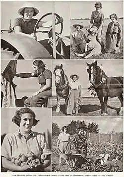 In November 1941 the Government announced that it would establish a national Women's Land Corps.[4] City girls from the age of 18 and up were "sent to assist on sheep, cattle, dairy, orchard and poultry properties".[5] Recruitment of members was originally undertaken by the Women's War Service Auxiliary, but the scheme was reorganised in September 1942 and redeveloped as the Women's Land Service. With the reorganisation the basic wages were increased, the uniform and working clothes were liberalised, farmers could employ their relatives, and district Man-Power Officers became responsible for recruitment. These changes made the Service more attractive to both women and farmers and membership increased during the following two years.[1][6]