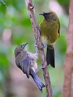 Courtship occurs in August and September, during which a pair of bellbirds can be seen chasing each other or singing together.[47] Male courtship behaviour includes hovering or slowly ascending with his body in a vertical position, producing a whirring sound with his wings.[31] Courtship feeding sometimes occurs, during which the male feeds the female.[57] Courtship behaviour intensifies as they get closer to nest building.[47] The female constructs a cup-shaped nest from twigs, moss and fibres,[56][47] lining it with fine grasses, wool and feathers.[56][31] While the nest is usually situated in a tree, on some islands it may be located in a rock or trunk cavity.[56] On a tree, it could be placed from ground level to about 15 m high.[31] On Tiritiri Matangi, most nests were placed under the hanging fronds of tree ferns.[47] Nest building takes about 3–7 days.[47]