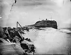Fort Scratchley is a fort atop a knoll overlooking Nobbys Beach. It was designed by Lt. Col. Peter Scratchley and built between 1881 and 1886. While its original purpose was to protect the colony against a feared Russian invasion, its most prominent role came during World War II when the guns at the fort fired upon a Japanese submarine which shelled the city in 1942. The military role of the fort came to an end in 1972 and it now houses the Newcastle Region Maritime and Military Museum.[5] Damage from the Japanese Navy attack during World War II can still be seen on the front of some of the buildings in East End. Today Fort Scratchley is a visitor attraction with views of the city and coastline, displays of military artefacts, and tunnel tours. Fort Scratchley also has a library of military books operated by the Fort Scratchley Historical Society.