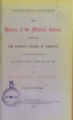 - ^ Dennis Embleton (1890). Collegium Medicum Novocastrense : the history of the Medical School, afterwards the Durham College of Medicine at Newcastle-upon-Tyne, for forty years, from 1832 to 1872. Andrew Reid, Sons & Co. pp. 3–12.