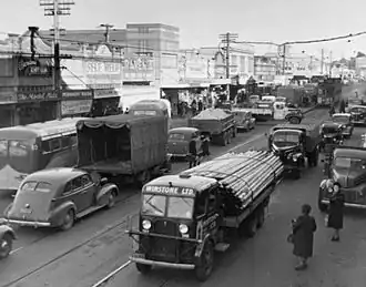 Traffic remains a major factor in the area, as Broadway carries over 40,000 vehicles a day, limiting the ability of pedestrians in the shopping district to cross the main road.[11][12] An ambitious earlier plan from 2003 to construct a "road over rail" above the railway line, from the northwest end of Newmarket near Park Road, to the southeast near the St Marks Road interchange, did not go ahead, even though this could have significantly reduced vehicle traffic on Broadway.[13] A late 2000s upgrade has however provided new high-quality bluestone footpaths along Broadway and some of the side-streets.[14]