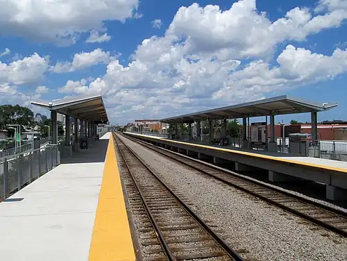Newmarket station is an MBTA Commuter Rail station in Boston, Massachusetts. It serves the Fairmount Line and a small number of Franklin/Foxboro Line trains. It is located off Massachusetts Avenue at Newmarket Square in the Dorchester neighborhood. The station has two 800-foot (240 m) high-level platforms and sloping walkways connecting it to Massachusetts Avenue.[4] Originally planned to be in service in 2011, it opened on July 1, 2013, along with Four Corners/Geneva station.[1]