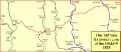 In order better to serve the ironworks in the South Wales Valleys, the NA&HR built the Taff Vale Extension Line, running west from Pontypool and cutting across several of the valleys, making connections with other companies' lines, eventually at twelve locations. The line was opened in stages from 1857, and included the Crumlin Viaduct crossing the valley of the Ebbw River.