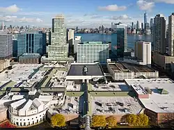 Many buildings offer views of the Hudson River and the New York City skyline. A portion of the Hudson River Waterfront Walkway runs through Newport.