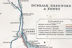 The port of Newry was already a transport hub by 1742 with the opening of the Newry Canal to Lough Neagh.[10] By the start of the twentieth century Newry had become a railway hub, with the Belfast to Dublin line passing to the west of the town, while lines from the ports of Warrenpoint and Greenore either side of Carlingford Lough converged closer to the centre of town where stations were more conveniently situated. All converged at Goraghwood to the north of Newry where a line also diverged off to the north-west towards Armagh.