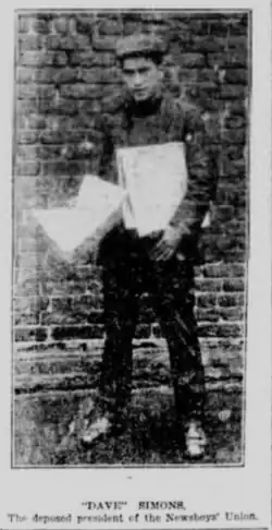 David Simmons was president of the newsboy union at the beginning of the strike, and treasurer in the second half, after he was accused of betraying the strike and was forced to step back from his leadership role.[30] He was twenty-one at the time of the strike and had been selling newspapers since the age of eight. He was also a well-known amateur prizefighter at the local athletic clubs.[23]