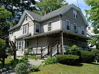 The Newton Lamson House is a historic house at 33 Chestnut Street in the Nobility Hill section of Stoneham, Massachusetts. Built c. 1887, it is one of Stoneham's finest Queen Anne/Stick style houses. It has a rectangular plan, with a gable roof that has a cross gable centered on the south side. The gable ends are clad in decorative cut shingles, and the gables are decorated with Stick-style vergeboard elements. Below the eaves hangs a decorative wave-patterned valance. The porch has turned posts and balusters. It is further enhanced by its position in the center of a group of stylish period houses, including the Sidney A. Hill House and the Franklin B. Jenkins House.[2]