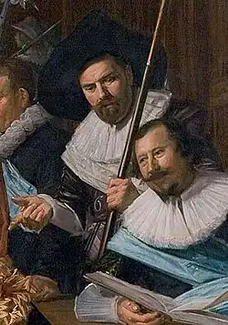 Detail of 1633 schutterstuk by Frans Hals, with Nicolaes Olycan with pike and Hendrik Pot with book