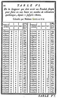 She met Jérôme Lalande, with whom she would work for thirty years, in 1753 when he was called as a representative of the Académie des Sciences to inspect her husband's work on a pendulum of a new type. The three of them worked together on a book titled Traité d'horlogerie (Treatise of Clockmaking) that was published in 1755 under her husband's name.[1][8] Although she did not receive authorship, Lalande sang her praises later, saying, "Madame Lepaute computed for this book a table of numbers of oscillations for pendulums of different lengths, or the lengths for each given number of vibrations, from that of 18 lignes, that does 18000 vibrations per hour, up to that of 3000 leagues".[4][1][5][2]