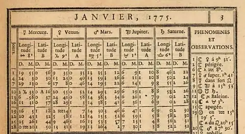 Page of the Ephemerides for the year 1775, in which Lepaute calculated the position of Saturn