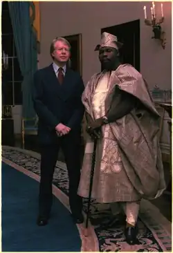 Nigeria–U.S. relations improved considerably from 1977, largely because of the election of Jimmy Carter as U.S. president. Carter's foreign policy on Africa has been characterised as differing significantly from that of his predecessors – not only in its emphasis on Africa,[44] but also in its resistance to the Cold War realpolitik of the Kissinger era, which, in the words of Cyrus Vance, Carter's Secretary of State, treated Africa "as a testing ground of East–West competition".[45][30] Instead, Carter sought to project the U.S.'s liberal image abroad, emphasising principles of global justice and human rights; he also publicly denounced apartheid, and criticised the Ford administration's strategy in the Angolan Civil War.[46][45] Additionally, Carter appointed as U.S. ambassador to the United Nations a young black Congressman, Andrew Young, who had pre-existing[46] personal friendships with both Lieutenant General Olusegun Obasanjo, the Nigerian head of state, and Brigadier Joe Garba, the Nigerian Commissioner for External Affairs.[37][26] More generally, the U.S., and its ambassador to Nigeria, Donald B. Easum, emphasised the U.S.'s intention to consult Nigeria closely on its foreign policy elsewhere in Africa.[26][44] The effect of both changes was "an opportunity for a fresh start" in Nigeria–U.S. relations.[26] Moreover, circumstances might have led Nigerian leaders to reconsider their hardline foreign policy stance: both the deterioration of the Nigerian economy, and the poor progress of Southern African liberation movements, made diplomatic rapprochement with the U.S. an appealing and even necessary course.[29] Carter's determination to curb dependence on foreign oil imports, combined with a damaging fall in Nigerian oil earnings due to a global supply glut, also made it important to shore up Nigeria's economic ties to the U.S.[47] (And, indeed, in 1977, more than 80% of Nigerian oil exports went to the U.S.)[48]