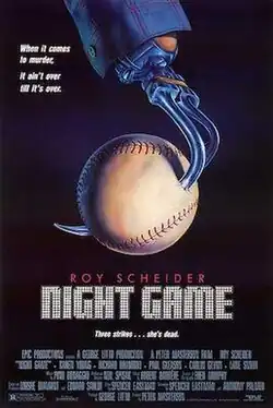 Night Game is a 1989 American slasher film[3][4] directed by Peter Masterson and starring Roy Scheider, Lane Smith, Karen Young, and Richard Bradford. It follows a police detective attempting to stop a hook-handed serial killer whose murders coincide with nighttime baseball games at the Houston Astrodome.