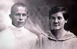 When World War I broke out in 1914, Khrushchev was exempt from conscription because he was a skilled metal worker. He was employed by a workshop that serviced ten mines, and he was involved in several strikes that demanded higher pay, better working conditions, and an end to the war.[16] In 1914, he married Yefrosinia Pisareva, daughter of the lift operator at the Rutchenkovo mine. In 1915, they had a daughter, Yulia, and in 1917, a son, Leonid.[17]