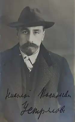 Ustryalov was born in Saint Petersburg. He graduated in law from Moscow University in 1913.[1] Teaching at Moscow University, he was initially a member of the Constitutional Democratic Party.[1][2] Ustryalov belonged to a tendency of Slavophile intellectuals, although from early on he departed from his contemporaries by being less enthusiastic about the Eastern Orthodox Church than the likes of Sergei Bulgakov and Peter Berngardovich Struve.[3] He started out as a supporter of the "Whites" in the Russian Civil War and saw service under the command of Aleksandr Kolchak.[1] However Ustryalov changed his views towards a fusion of nationalism with Bolshevism, with the new communism presented as the best hope for re-establishing Russia as an international power.[4]