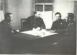 In March 1944, leading a group of German antifascists, he parachuted into the German rear to join the Logoysk "Bolshevik" Partisan Brigade, tasked with conducting agitation, on a special mission directed by the Central Committee of the Communist Party of Byelorussia.[24] The group was assessed by his superiors as having conducted significant work to demoralize German garrisons in the rear. In battle with German troops, attempting to encircle the partisans, Dyatlenko was seriously wounded, returning to Soviet lines in July. He was awarded a second Order of the Red Banner on 4 August in recognition of his performance in the operation.[25] Dyatlenko spent the remainder of the war in the political department of the Karelian Front's 32nd Army and in the Political Directorate of that front.[5] For his war service, Dyatlenko received two Orders of the Red Banner, the Order of the Red Star, and seven medals.[4]