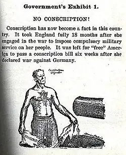The No Conscription League was an anarchist organisation designed to promote anti-draft manifestos and aid those who refused military service.[1] The league lasted for six weeks and was used to charge its founders Emma Goldman and Alexander Berkman with conspiracy to obstruct the draft.[1][2]
