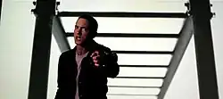 The music video was directed by American music video director Chris Robinson, who previously directed both Eminem and Lil Wayne in the "Drop the World" music video.[25] The video began shooting in June 2010.[26] A thirty-second teaser was released on September 29, 2010, on Eminem's official YouTube channel. It shows Eminem rapping inside of a recording studio, interlaced with scenes where an adolescent boy gets bullied.[27] Some of the music video was shot in front of a green screen.[28] Lil Wayne's part was filmed before he was incarcerated, according to a tweet from Eminem: "We got Wayne's verse filmed before he went away luckily. Gotta shoot the rest of a 'No Love' video real soon. Keep your head up Weezy!"[26] The official music video premiered on Thursday, September 30 on VEVO and various MTV channels at 7:56 PM EST.[15][27]