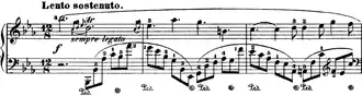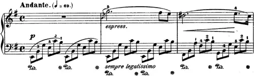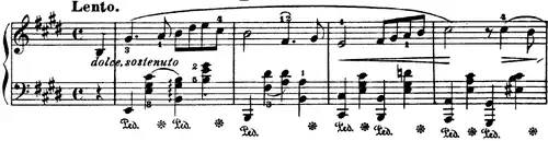 Chopin's nocturnes carry many similarities with those of Field while at the same time retaining a distinct, unique sound of their own. One aspect of the nocturne that Chopin continued from Field is the use of a song-like melody in the right hand. This is one of the most if not the most important features to the nocturne as a whole. The use of the melody as vocals bestowed a greater emotional depth to the piece, drawing the listener in to a greater extent.[5] Along with the right-hand melody, Chopin continued the use of another nocturne "necessity", that of playing broken chords on the left hand to act as the rhythm under his right-handed "vocal" melody. Another technique used by Field and continued by Chopin was the more extensive use of the pedal. By using the pedal more, the music gains more emotional expression through sustained notes, giving the piece an aura of drama.[10] With these main attributes of the "Field nocturne" Chopin was inspired, and expanded upon them to develop the "Chopin nocturne".
