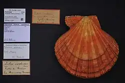 The lion's paw scallop is a species that consists of large scallop shells with ridges and bumps that have a rough texture. The shell is known for its distinct knobs on the ridges. Ranging from red to orange and also purple, the lion's paw scallop ranges in color. The shell's common name is derived from its appearance, the color, and the knobs giving it some visual similarities to the paw of a lion.[2]