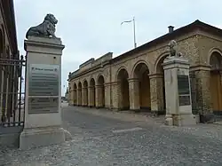 Located just south of the Port Authority Building, the former main entrance to the Nordre Toldbod area is a gate with gate pillars topped by lions. Just inside the gate, the access road passes between two long one-story buildings with 8-arch arcades facing the traffic. They were designed by Gustav Friedrich Hetsch and built in 1856.